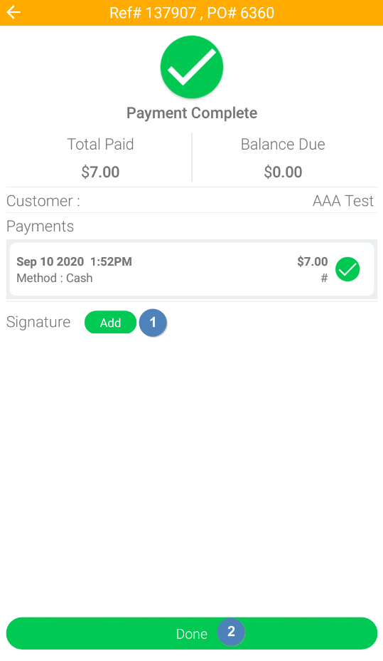 If a partial payment was applied, you will be taken back to the cart page. Any payments applied can be viewed by tapping the green ($) icon directly above the Add Payment button.