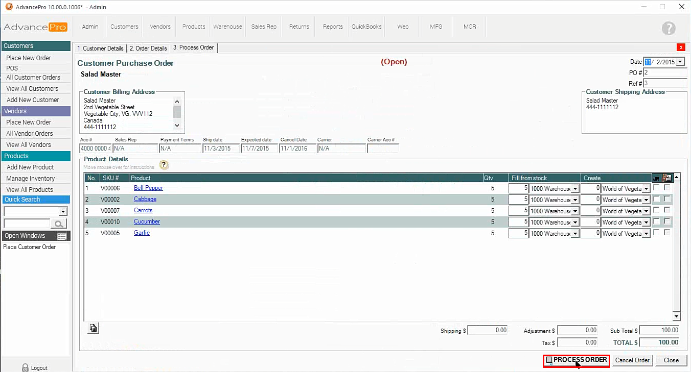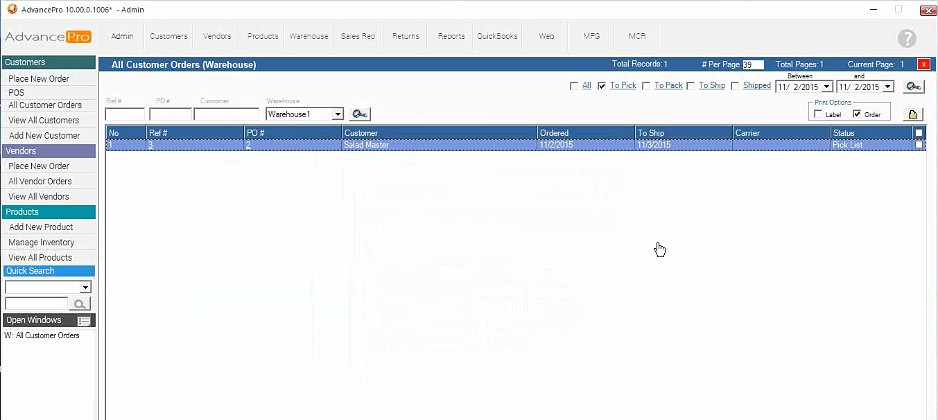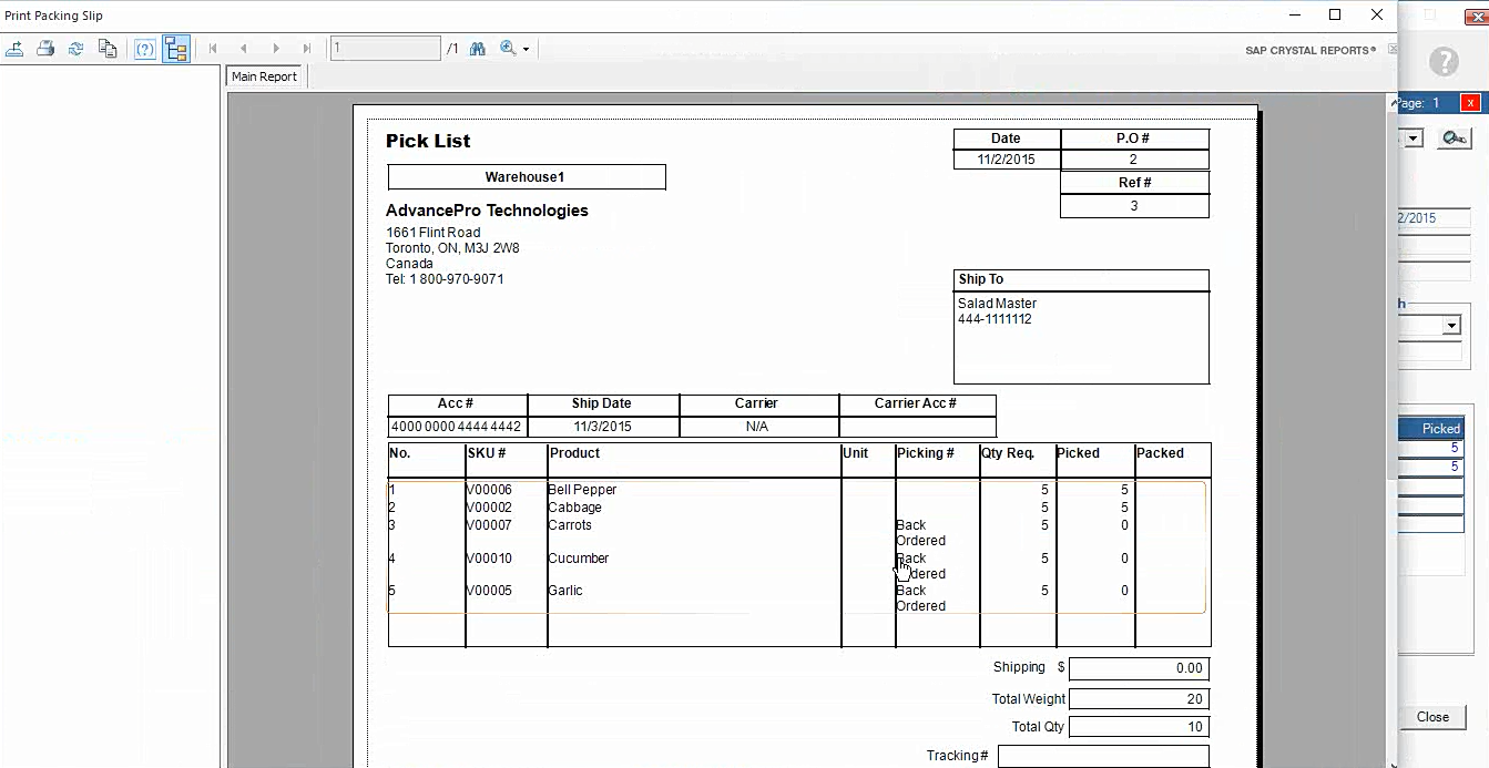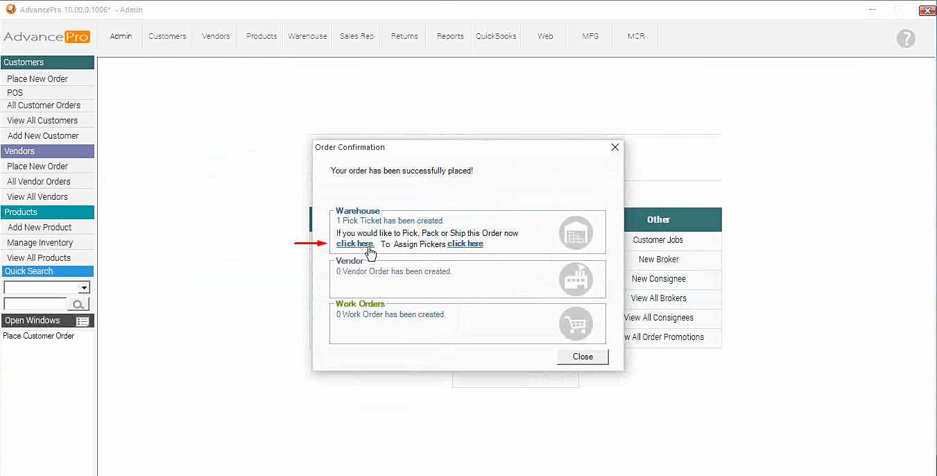 3. Open the Pick Ticket generated after processing the order