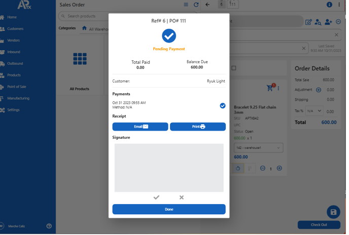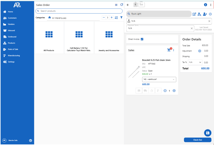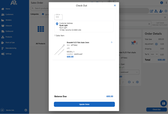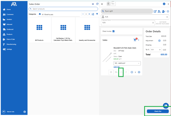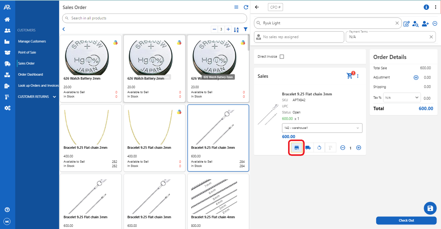 5. Select >> WAREHOUSE Icon to set your order to the Warehouse.