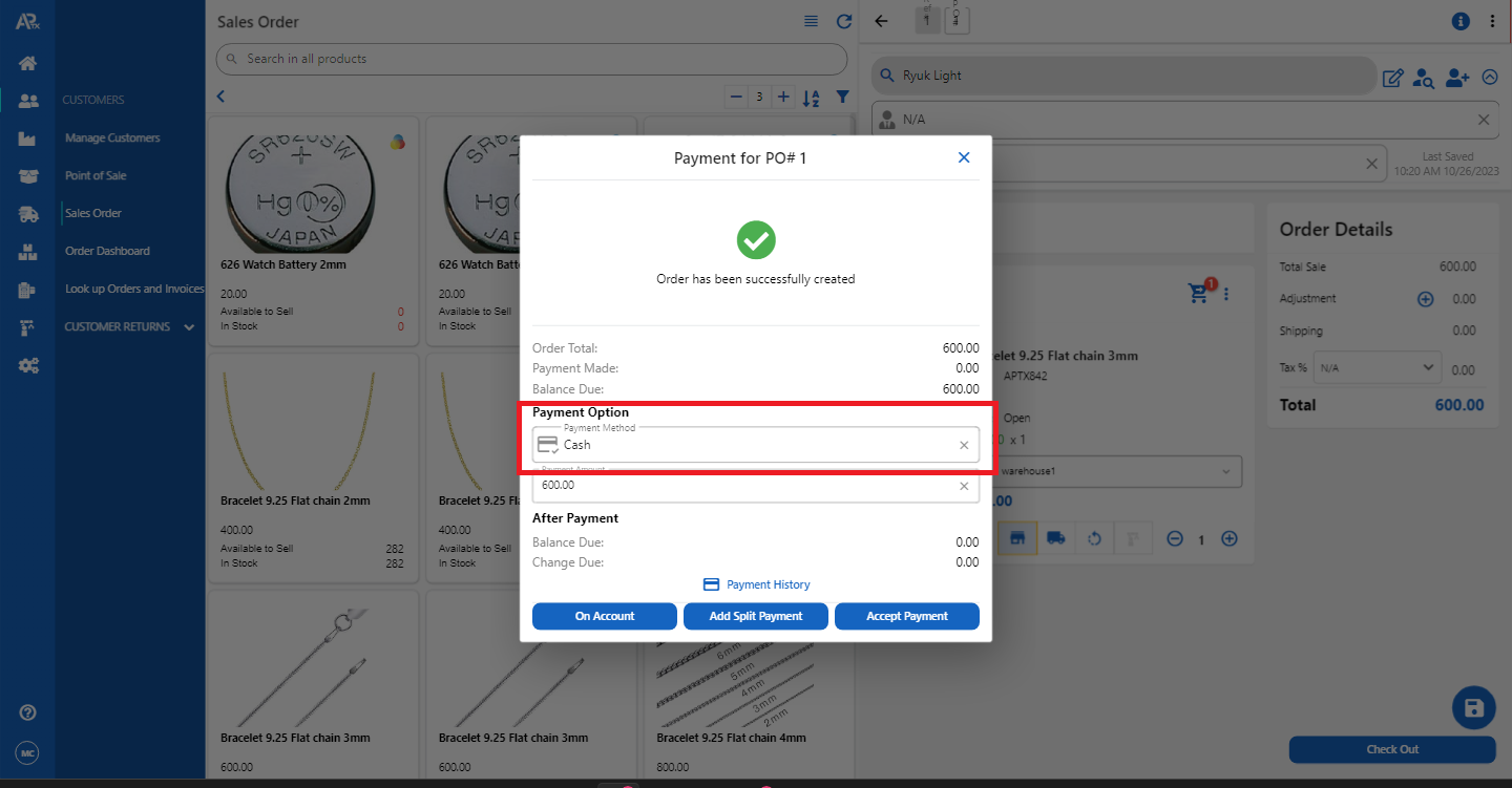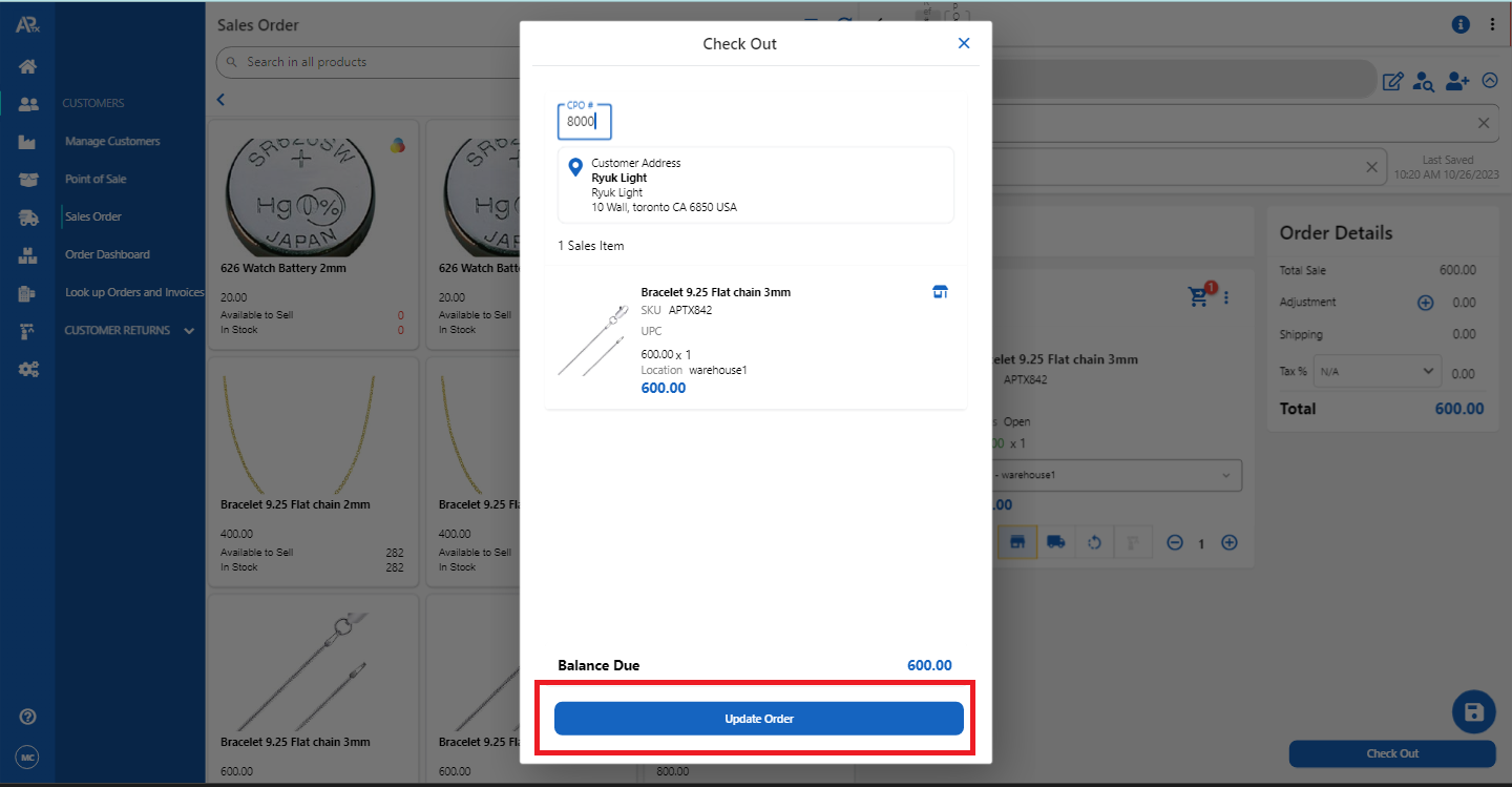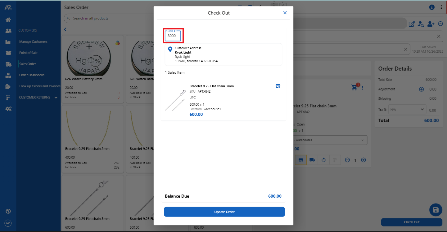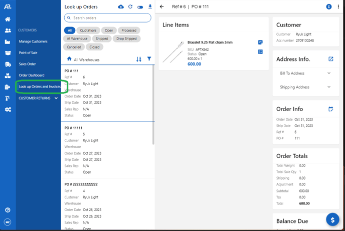 10. Go to >> CUSTOMER, Select >> LOOK UP ORDERS AND INVOICES >> Select >> PO#