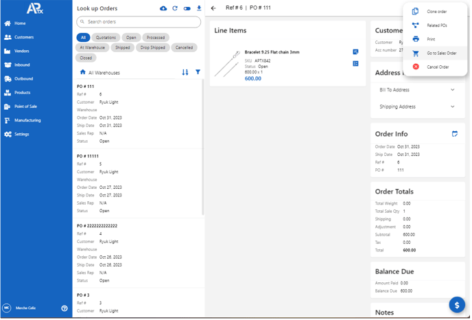 11. Select the three dots on the upper right portion and Select >> GO TO SALES ORDER