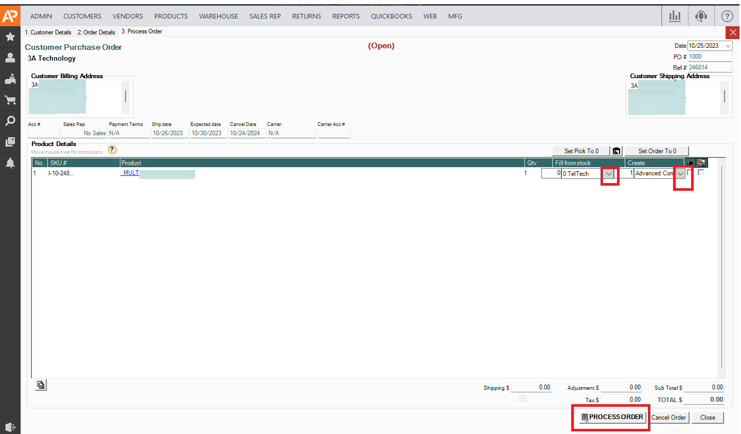 1. Select >> WAREHOUSE location you like and select PROCESS ORDER when finished
