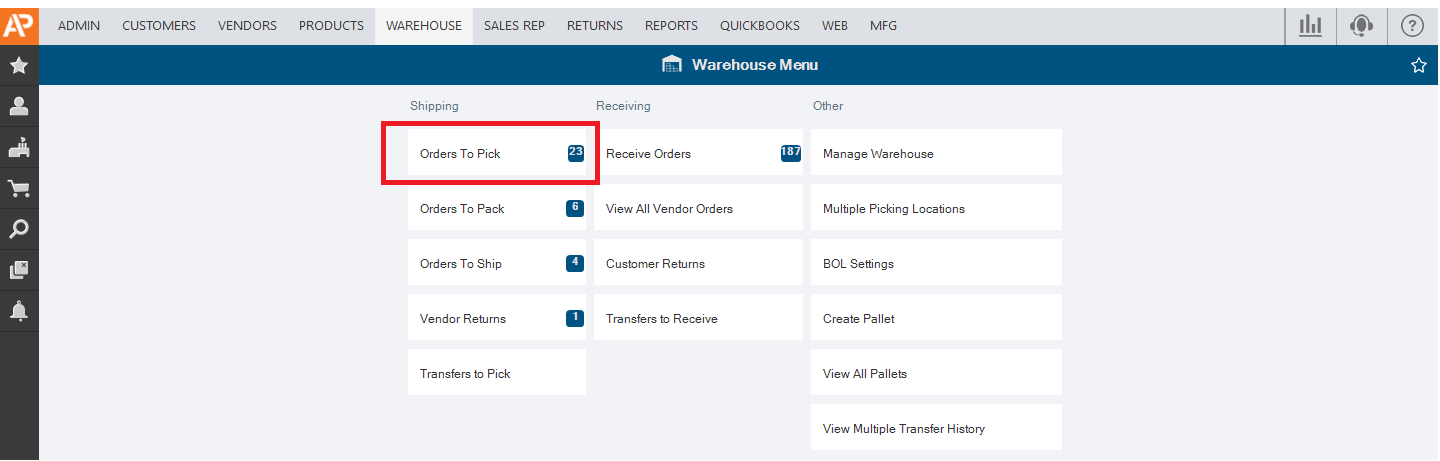 4. Select >> ORDERS TO PICK