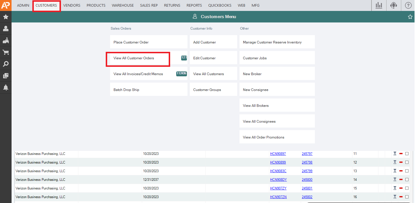 8. Find the Order that was sent back. Go back to Customers >> VIEW ALL CUSTOMER ORDERS.