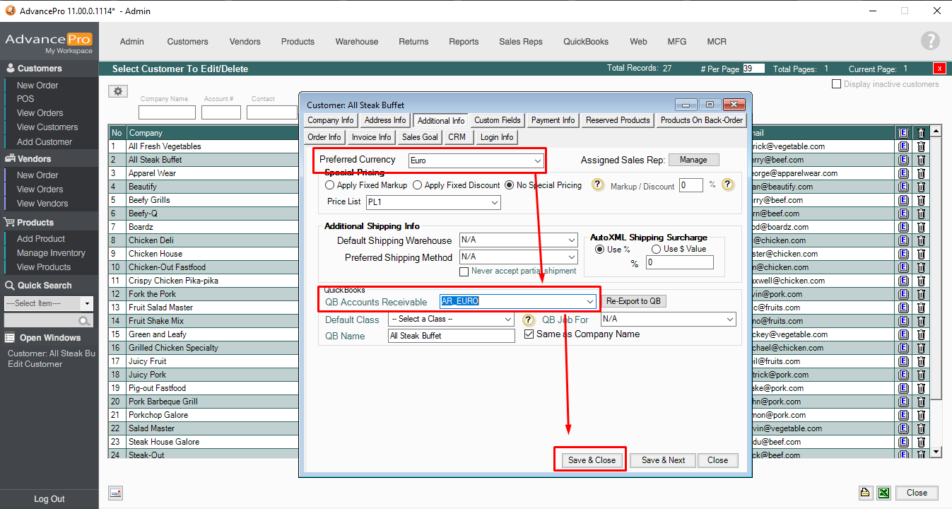 Under “Additional Info” tab, set the preferred currency and AR account. Save and exit