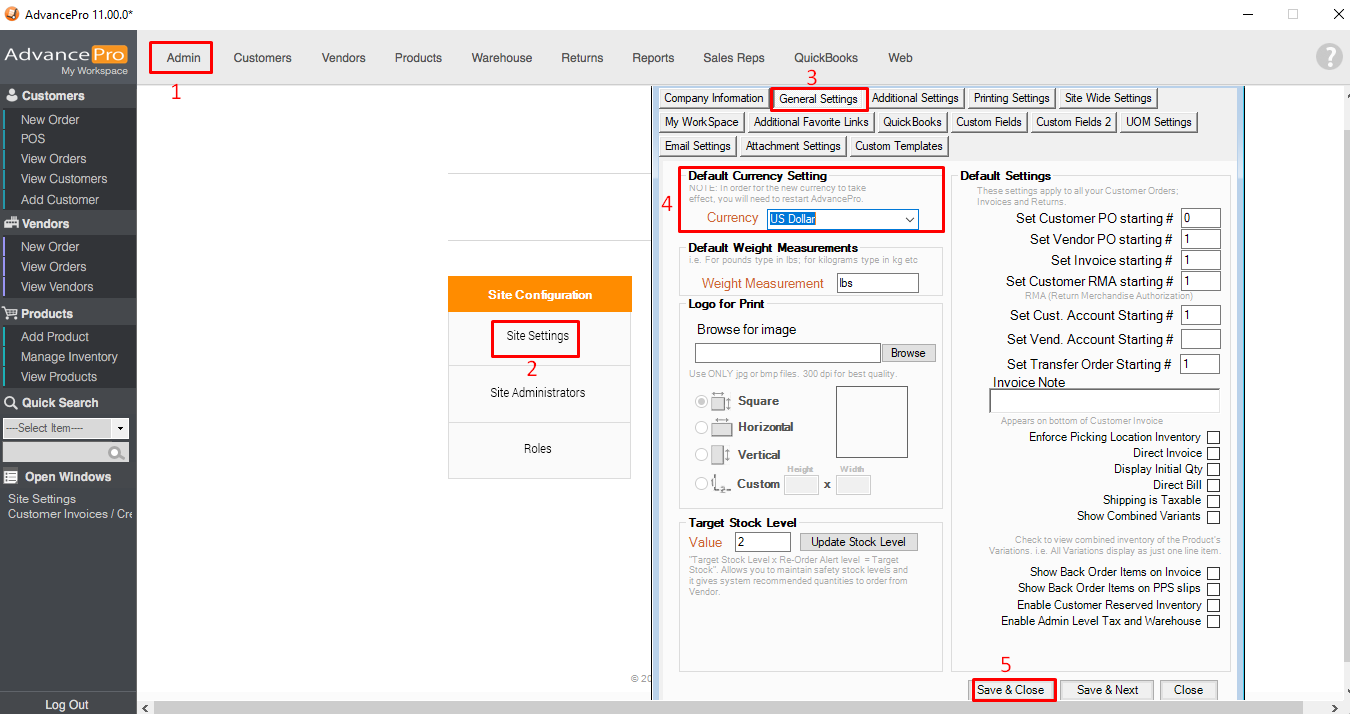 Go to ADMIN > Site Settings > General Settings tab > Select the default currency by clicking on the drop-down list > Hit Save & Close button.
