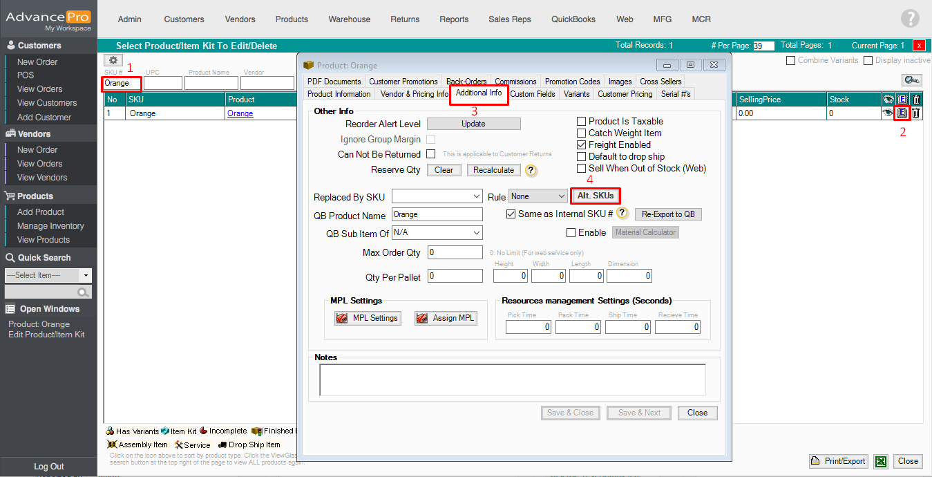 2. Search the Main product, In this example "Orange" --> Click on Edit --> Additional Info Tab --> Click on "Alt.SKU" button.