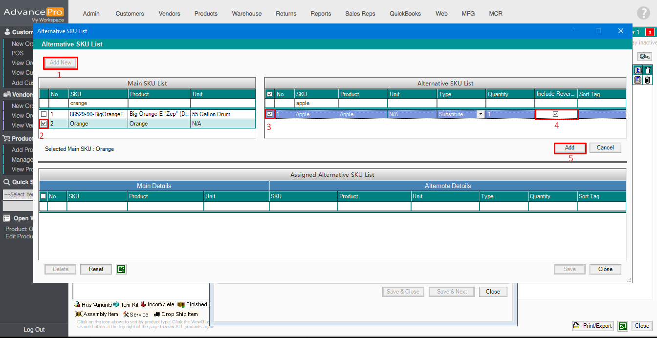 3. Click on "Alt.SKU" button --> Add New --> Select the Main product which is "Orange" and for the Child product is "Apple" in this example --> Select Click Add --> Click "Yes" to Save