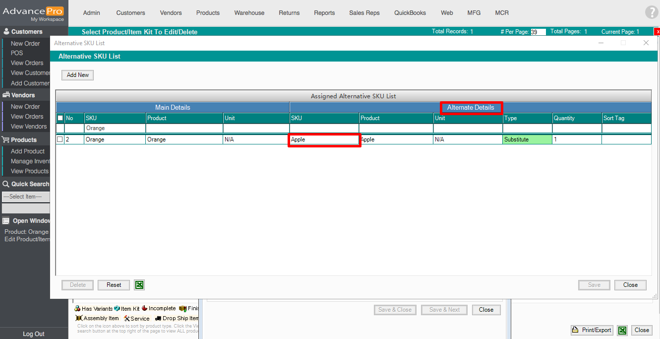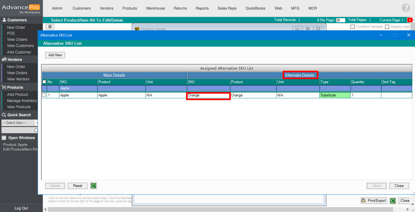4.1 Orange product (Main item) - the Alternative SKU is now set to "Apple"