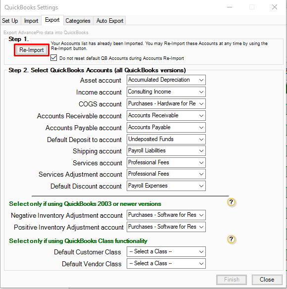 *Important! Make sure the "Do not reset default QuickBooks Accounts Re-Import" is checked.