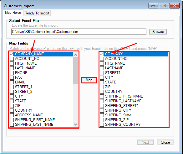 3. Browse the file to import; upon having the file on AdvancePro, your Excel fields would show on the RIGHT box. Match the AdvancePro fields on the LEFT with your Excel fields on the RIGHT and press MAP individually.