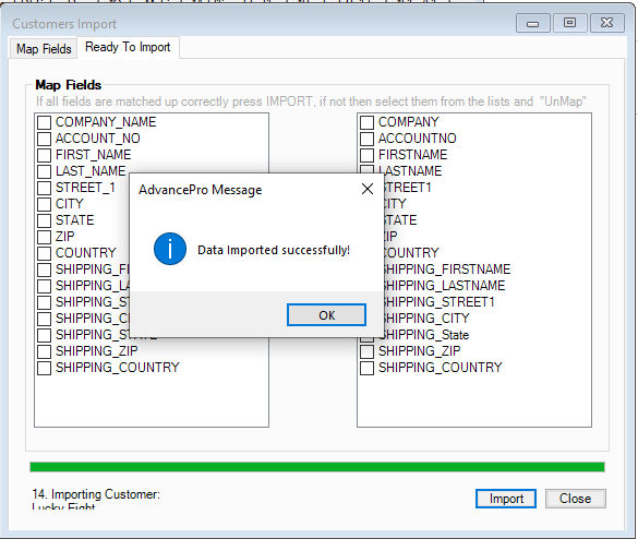5. Upon clicking 'Next', the pop-out box would show the fields matched to each other. Once you have verified the mapping of the fields, hit 'import'.