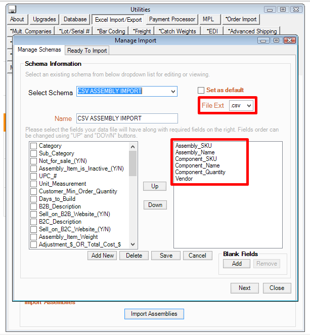 You may import your assemblies in CSV format using the same steps and mechanics found on this link: