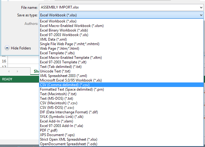 3. Create your Excel File with the correct Schema column sequence and Save as CSV (Comma-Delimited)