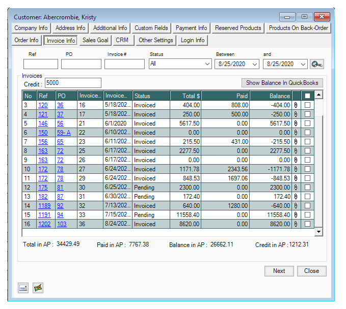 A total balance of invoices at the bottom of the page, and a static field under the customer’s name to show what the customer’s credit limit is.