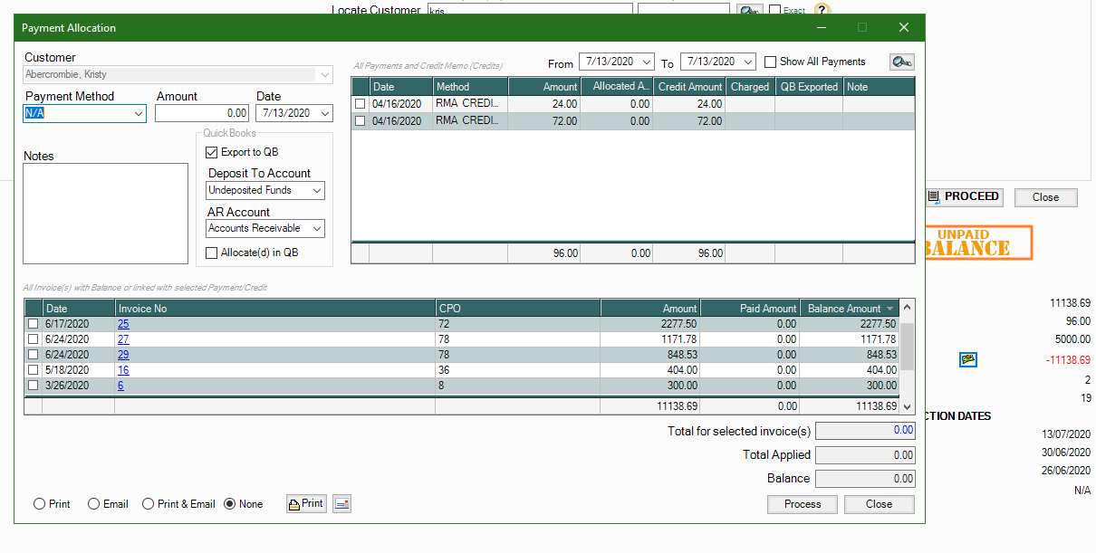 When you place an order for a customer, you will immediately see the live balances based on AdvancePro and you may also apply payments to their open balance here.