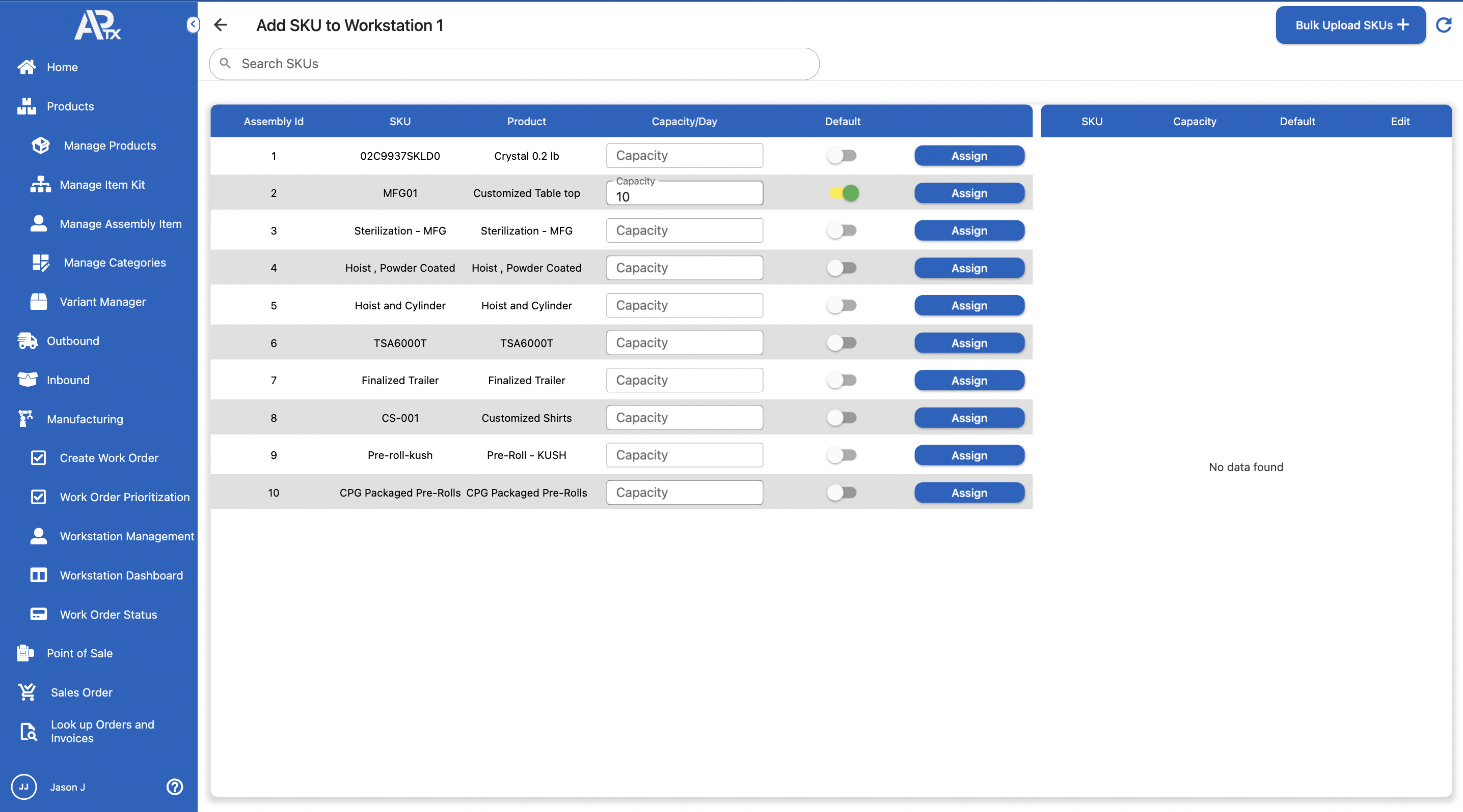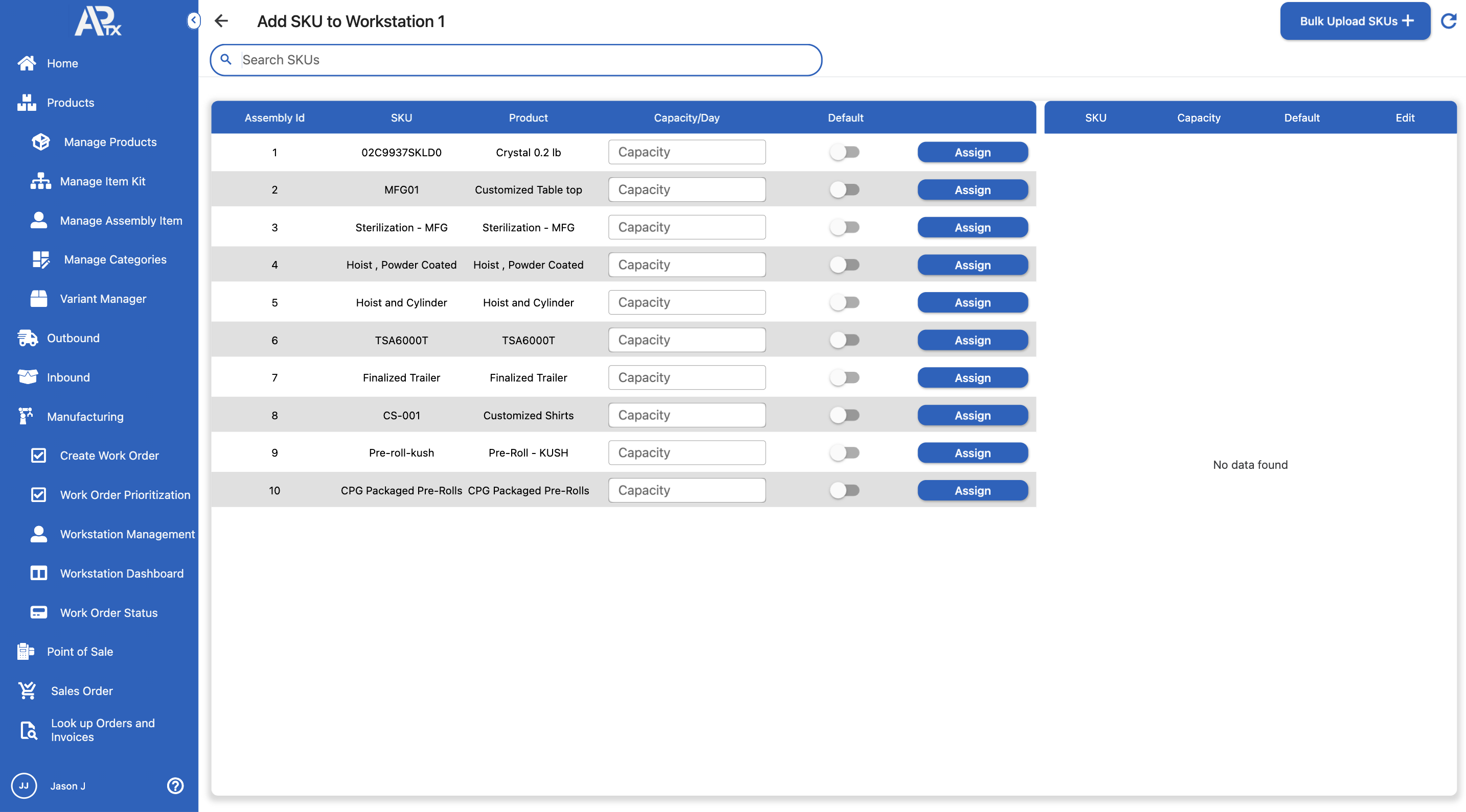 - On the left is a list of all predefined assembly item SKUs, and on the right is a list of all assembly SKUs already assigned to the workstation. To assign a SKU, use the search form to locate/filter the Product/SKU. After locating the necessary SKU, enter the capacity for the SKU into the capacity field.