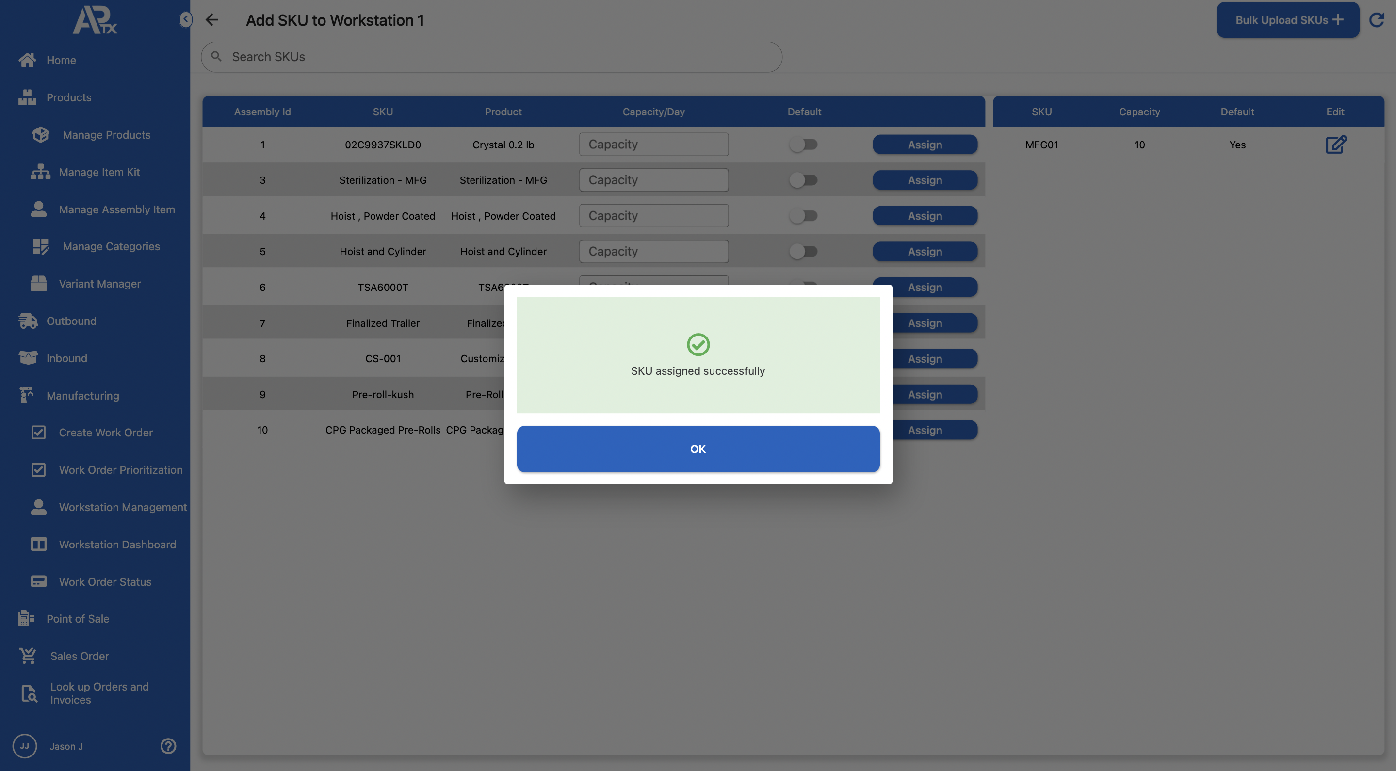 This capacity refers to the workstation's ability to produce a certain number of SKUs per day. Furthermore, the default switch allows a workstation to be the default workstation for the SKU that has been chosen. - Click on Assign