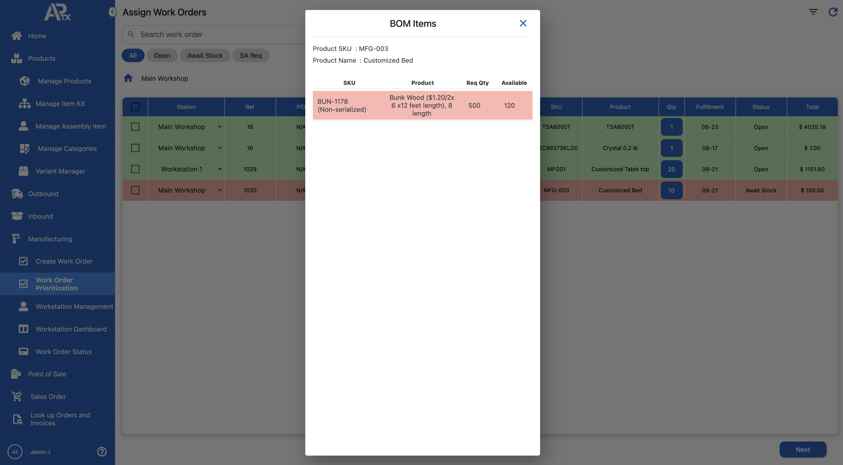 The BOM required for that work order can be viewed by clicking on any work order row, specifically on SKU. Out-of-stock items in the BOM list will be indicated in red.