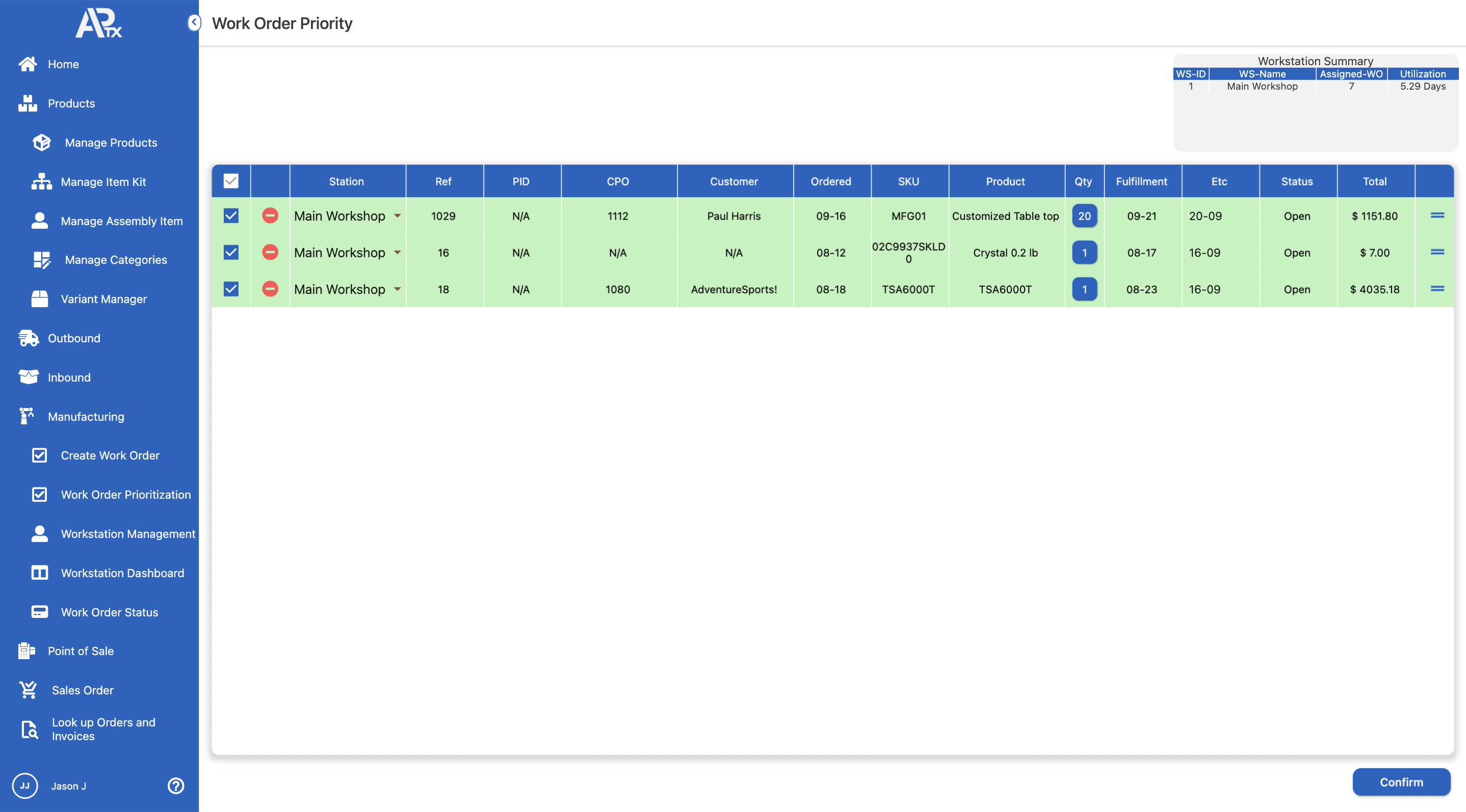 The APTX manufacturing module is a set of tools that allow a production manager to manage, prioritize, assign, and track work orders. A workstation user can also utilize the manufacturing capability to pick, assemble, and finalize work order