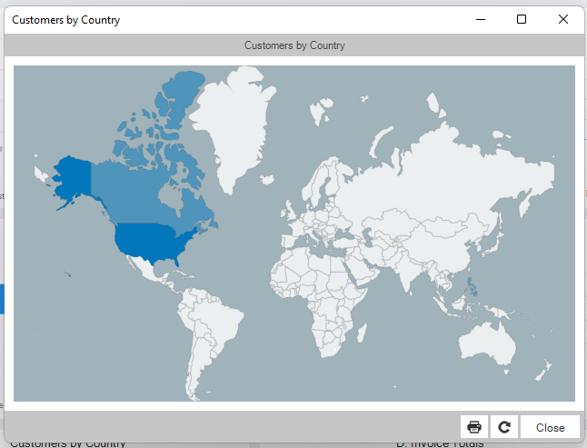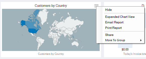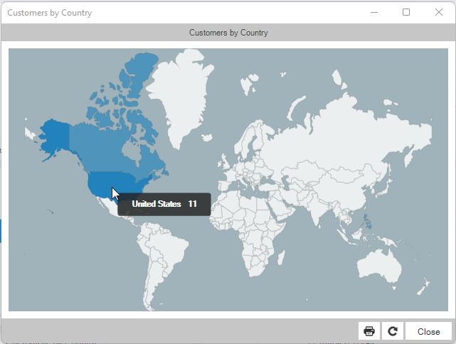 In this Customers by Country Report, you have the ability to hover your cursor and you will see how many customers are in a country.