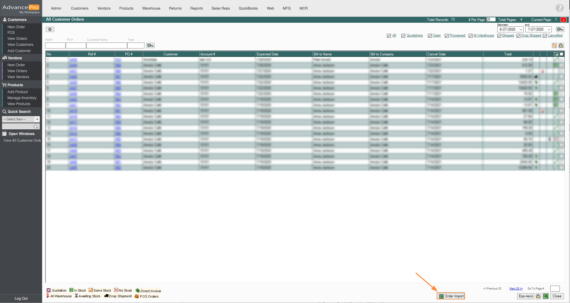 6. You may now verify that the orders have imported. Go to Customers > View All Customer Orders to see if the orders Imported properly.