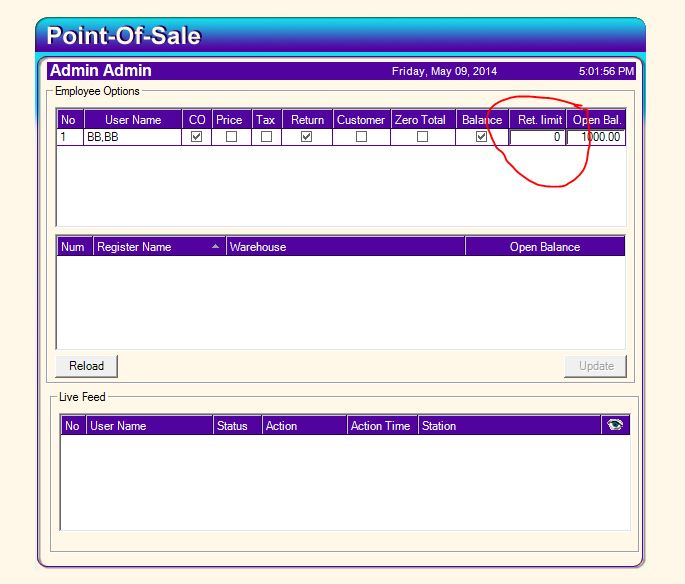 Login as standard AP User and not a POS user then click on the POS button. You will then see managerial screen and be able to set return limit for this user (refer to image below).