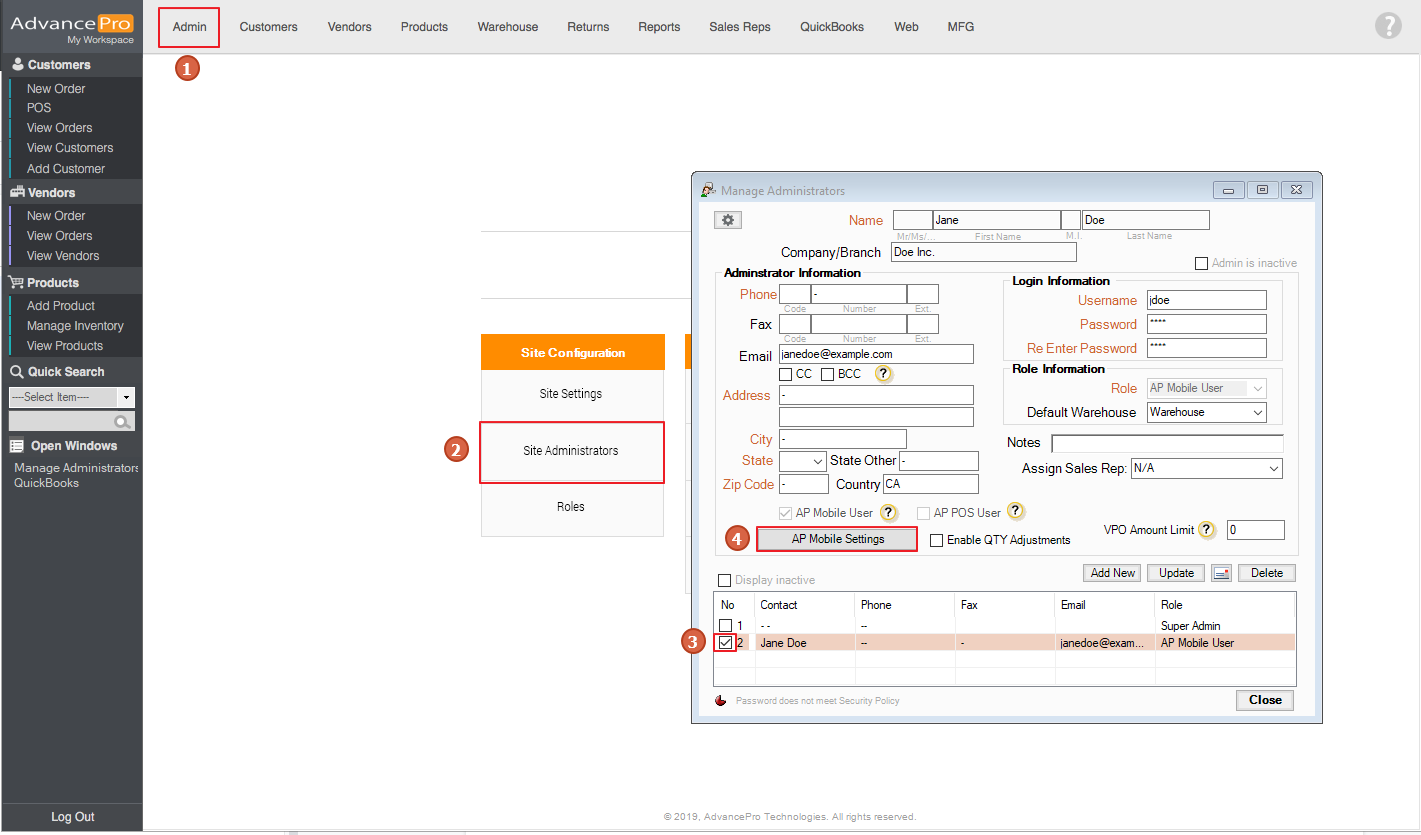 - To enable the settings for this feature, go to Admin > Site Administrators > select AP Mobile user > click on AP Mobile Settings