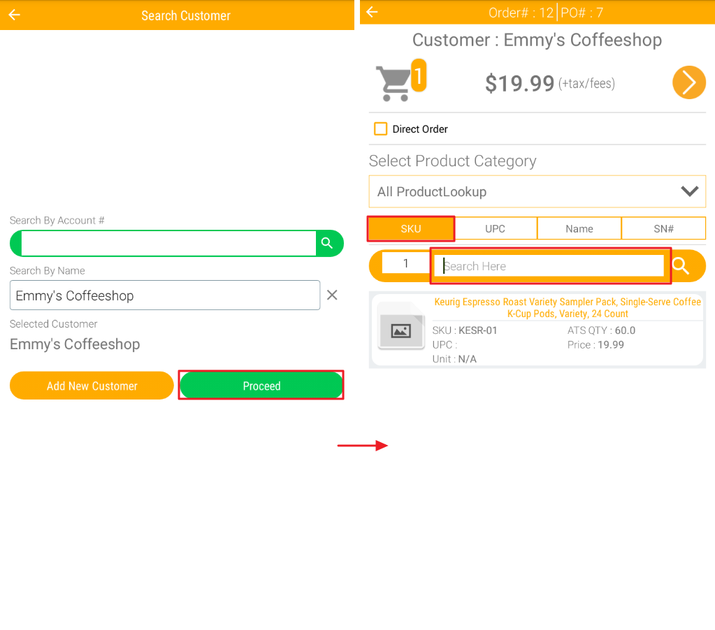 - Tap on Proceed and then it will take you to another screen. Here you can search for the Product SKU by tapping on SKU, input the Product SKU and tap on the magnifying glass icon and then it will automatically be added to the cart.
