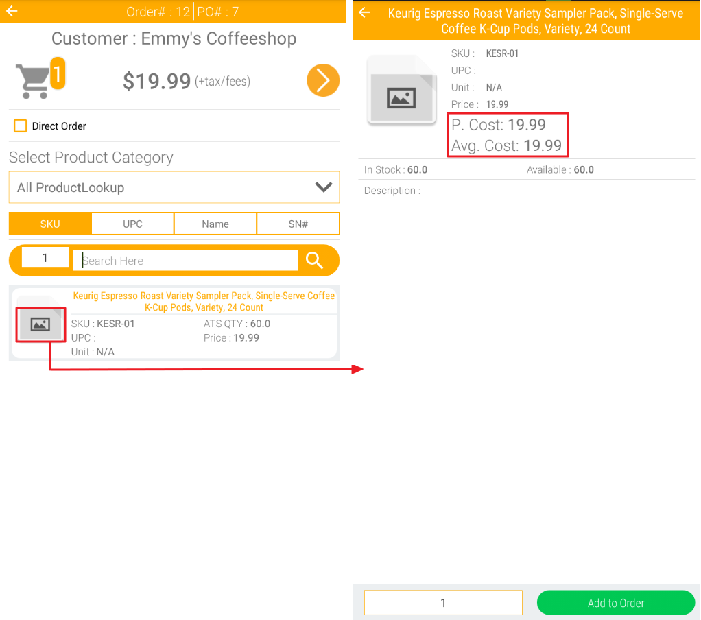 - You may tap on the image icon to view the Product information: Product Name, SKU, Price, P. Cost, Avg. Cost, In Stock and Available