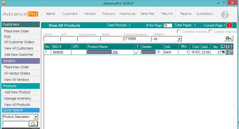 8. On the Quick Search area, select Product Description and enter the VSKU#. Hit Search
