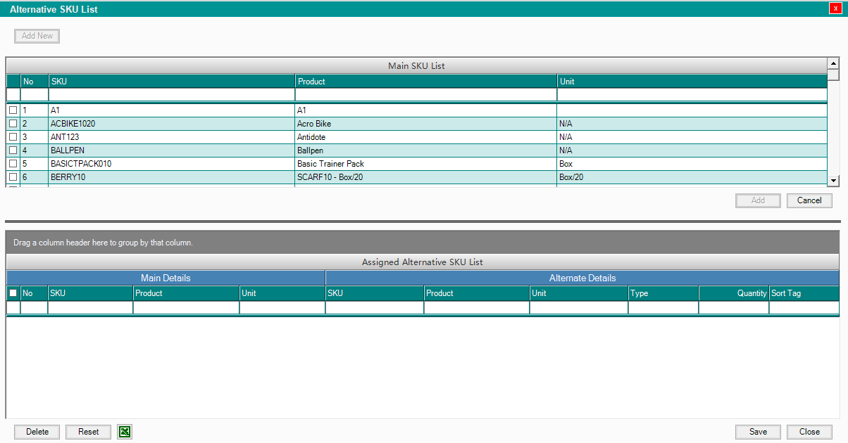 4. By clicking the checkbox of the product you want to select from the Main SKU List, the Alt SKU List will appear - these will be the assigned alternatives for the Main Product.
