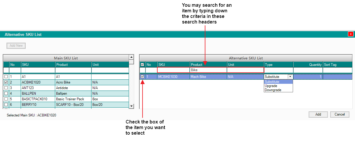 3. The Main SKU List will appear for you to select a product - this will be the product which you will assign Alternatives to.