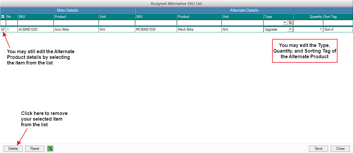 • Your selection will then be shown on the Assigned Alternative SKU List grid.