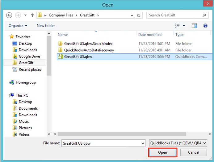 f3. Navigate to the QuickBooks company file, select it and click ‘Open’