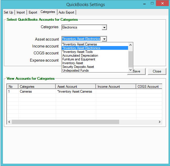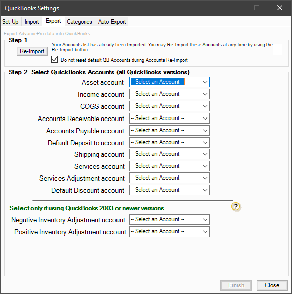 If you use different accounts for different types of items in QuickBooks, you can set category specific overrides in AdvancePro. For each category, you can specify an Asset, Income, COGS and Expense account that will override the default account settings. If all your products are assigned to the same accounts in QuickBooks, you can skip this step.