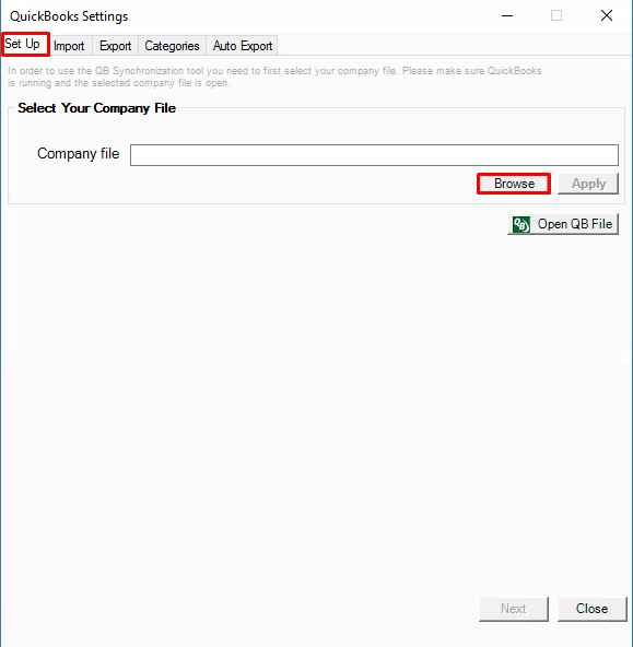 4. Temporarily close the QuickBooks company file if it is currently open, then click ‘Apply’ and ‘Open QuickBooks File'