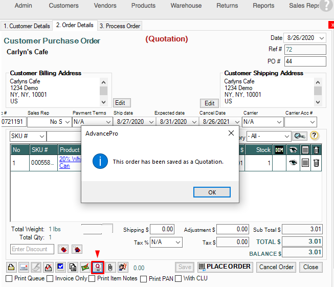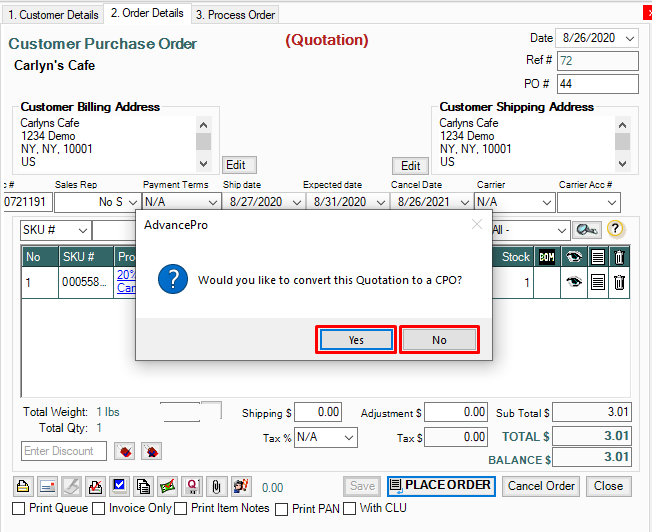 2. Once you PLACE ORDER it will prompt if 'Would you like to convert this Quotation to a CPO?'. If Yes, it will place the order, if No, it will return to the Quotation.