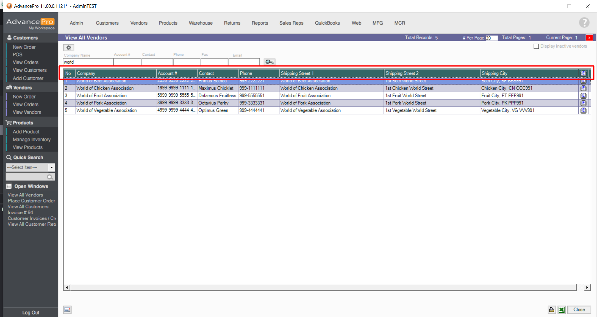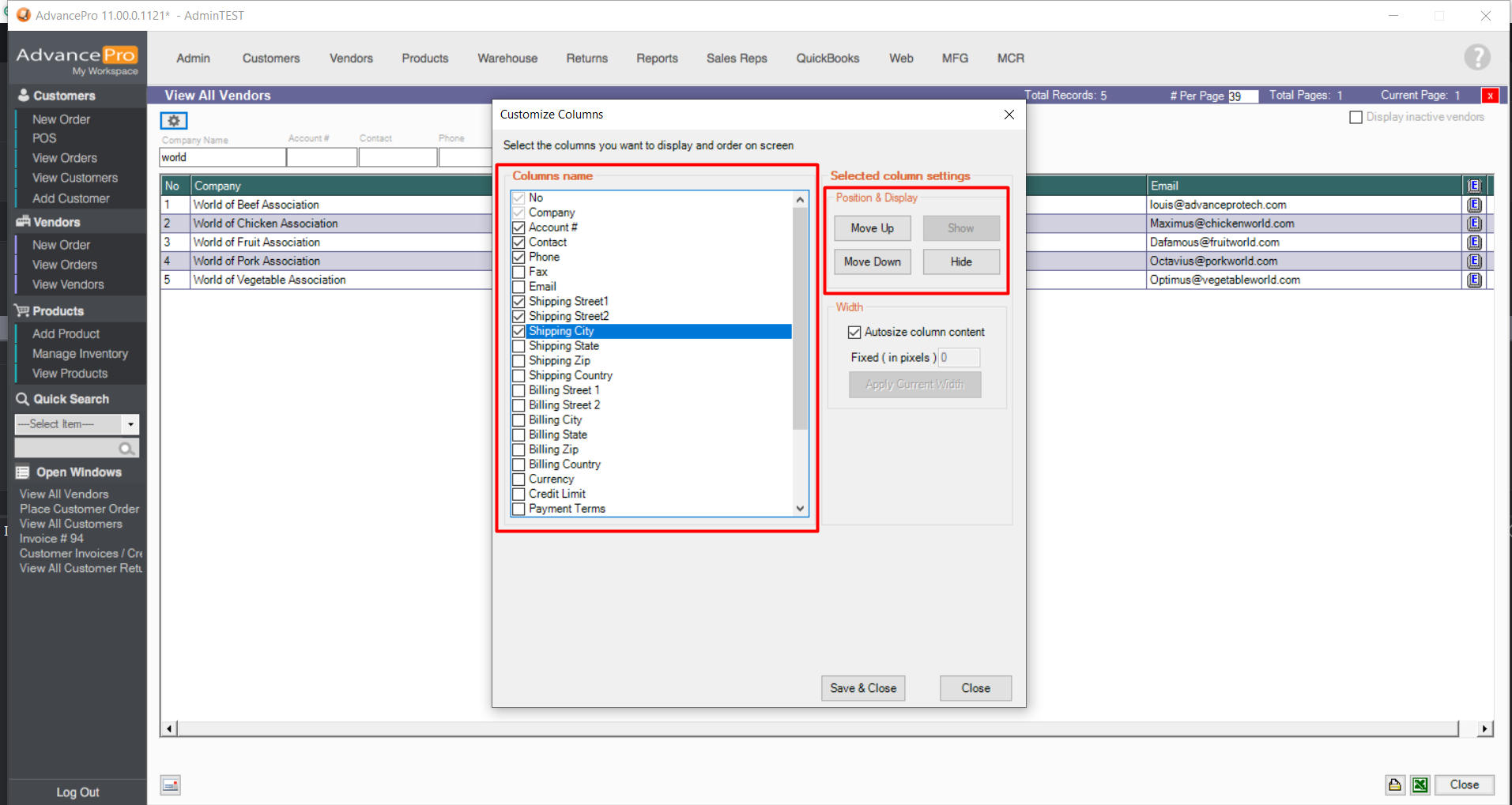 Select Columns to be shown in VIEW ALL CUSTOMERS/PRODUCTS/VENDORS
