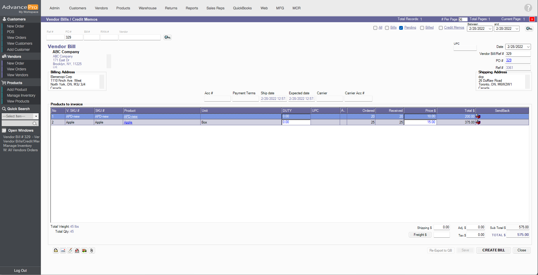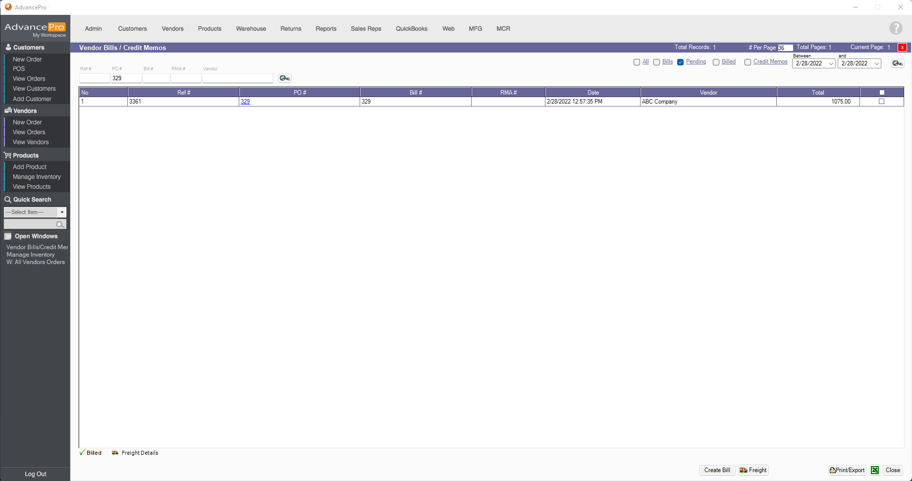 AdvancePro has added the ability to send a pending bill back to the warehouse.