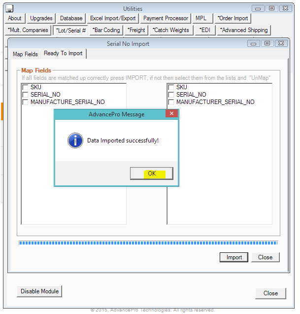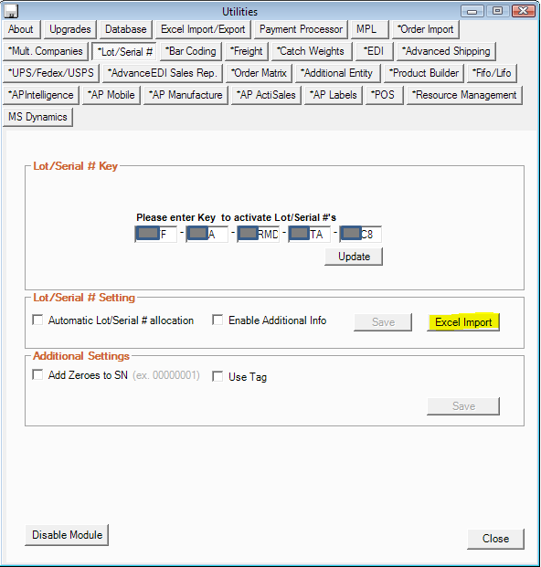 Go to Admin > Utilities > Lot/Serial # ; Excel Import