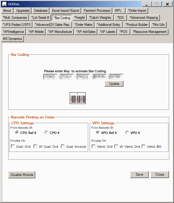 - Click on Admin > Utilities > Bar Coding, then double-click the image of the barcode to access the "Configure Vendor Barcode Schema" screen