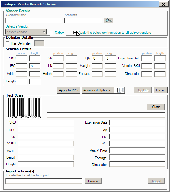 Note: This method can be applied to configure AdvancePro to scan UPCs by default instead of SKUs. To do so, select the "has delimiter" option and specify that the UPC code is in position 0. Don't forget to apply this setting to all vendors and apply to PPS as well if you use UPCs all the time.
