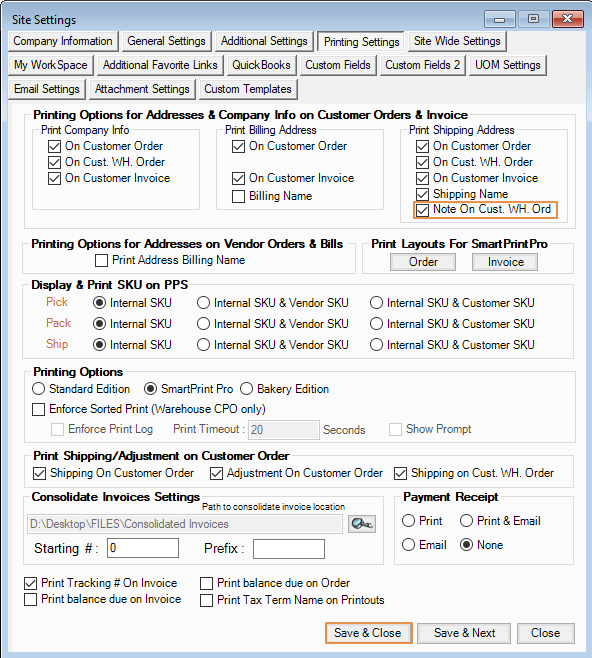- Under Print Shipping Address, enable Note On Cust. WH. Ord option and click on Save & Close