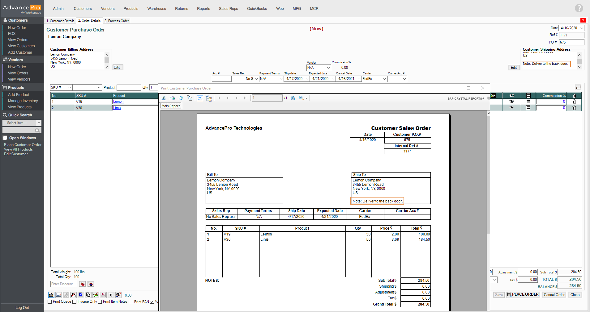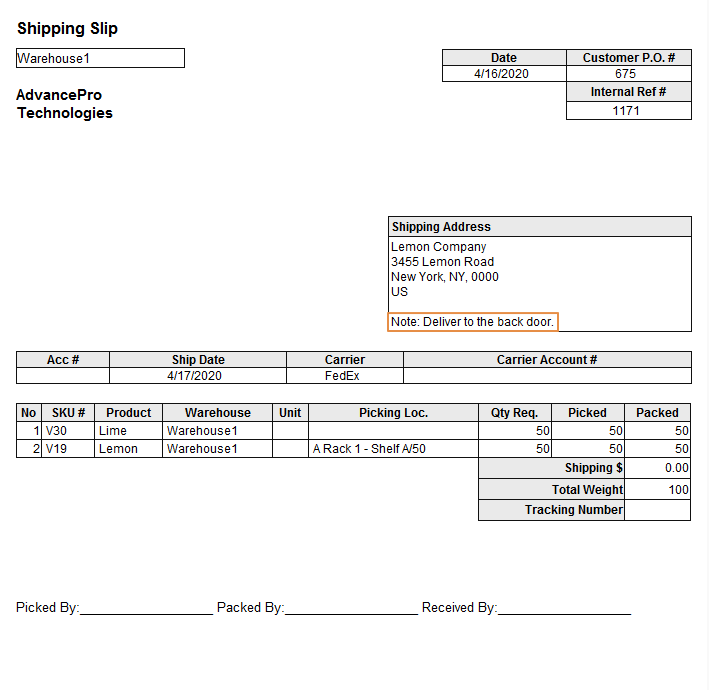 AdvancePro has added an ability to print or display notes on Shipping slips. This functionality can be used for leaving special instructions needed by the delivery person and are specific per shipping address.