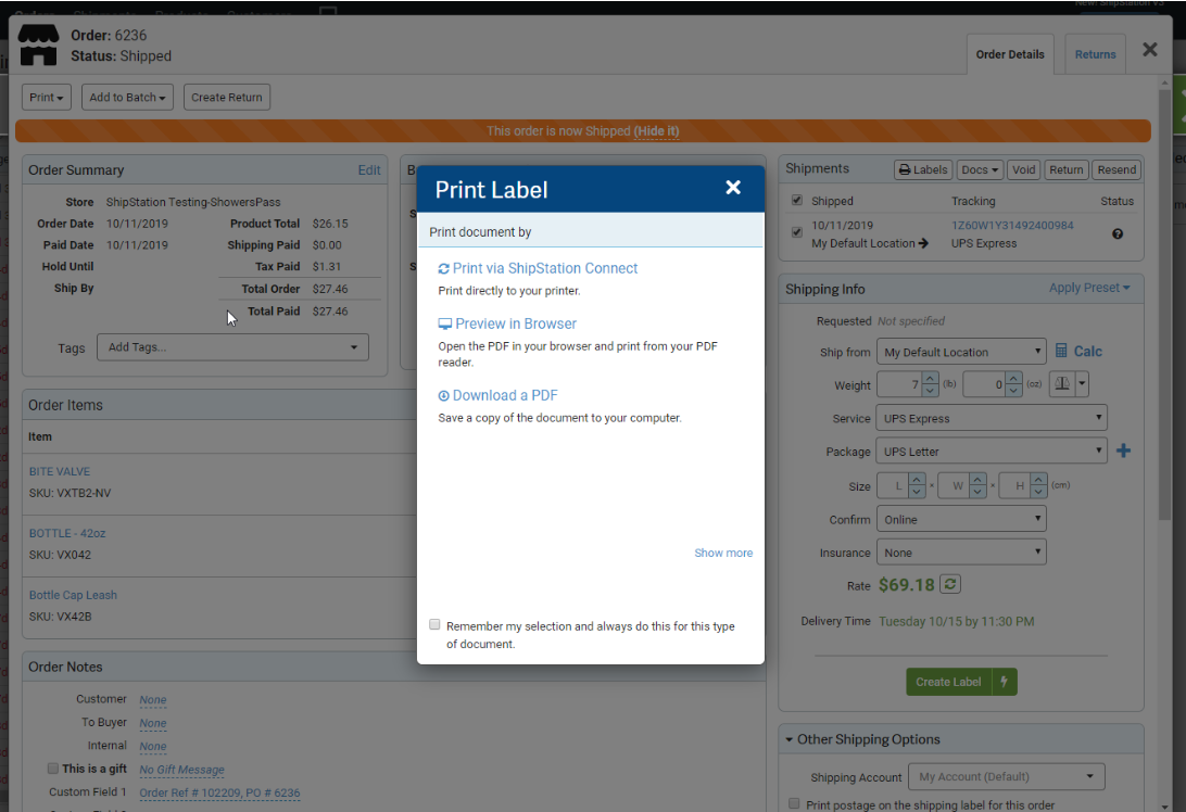 - This will be displayed after the Create Label button is clicked. It will notify the user that the order has been shipped and it will allow the user to print the shipping label