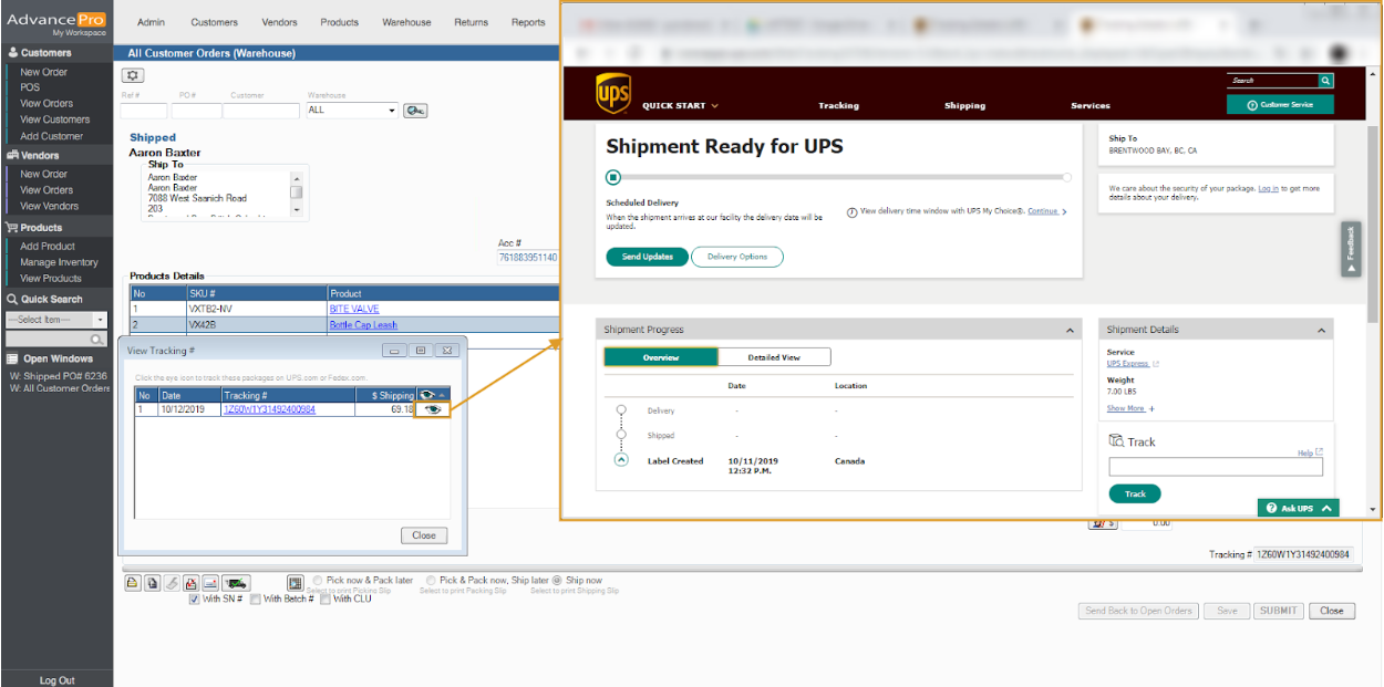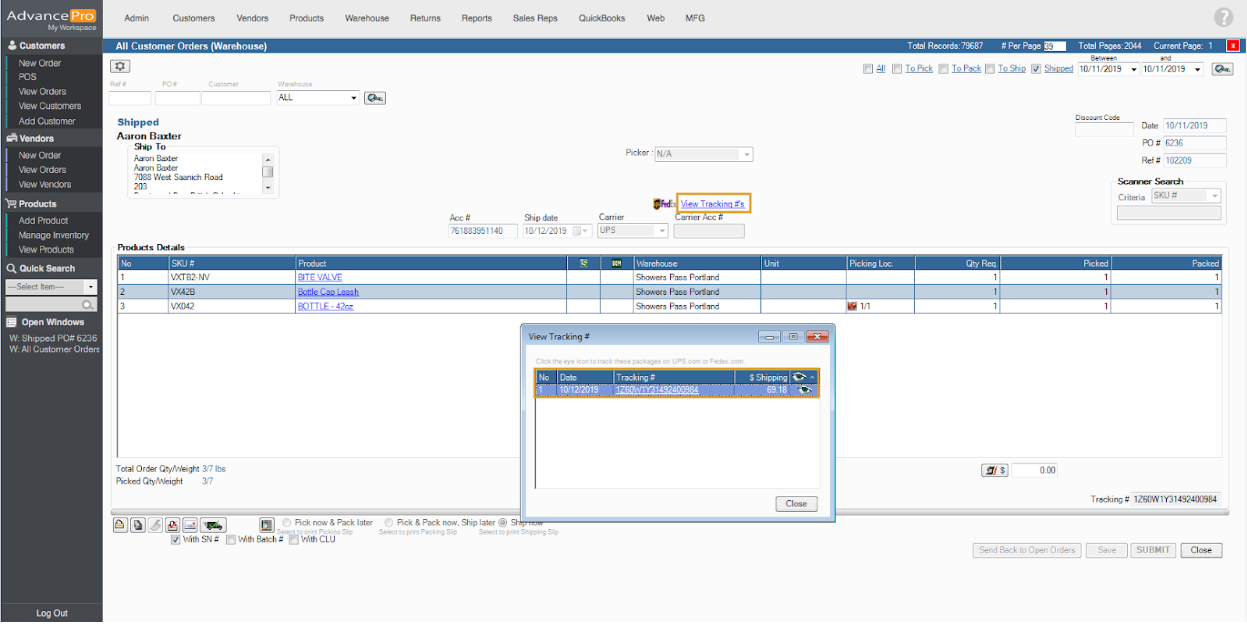 - Click on the order and the tracking number from ShipStation and shipping amount will be visible on the AdvancePro order when clicking “Shipping History” near the top-right of the order. It is also visible when clicking “View Tracking #’s” on the order in the warehouse.