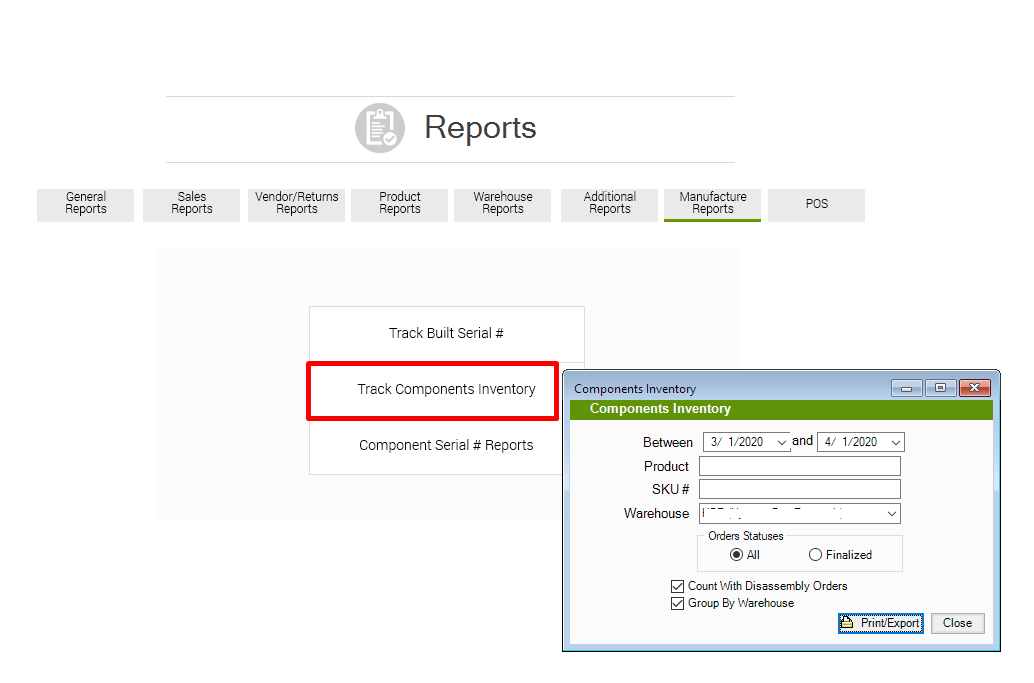 In the Reports Switchboard, click the Manufacture Reports button. Then click Track Components Inventory.