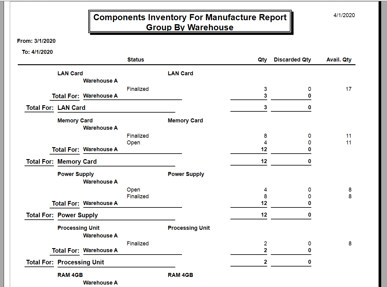 Indicate whether to group the inventory by warehouse, and whether to include disassembly orders using the checkboxes at the bottom of the form.