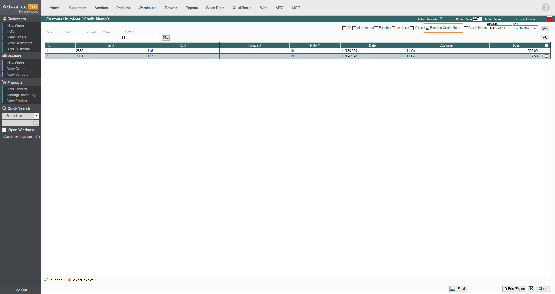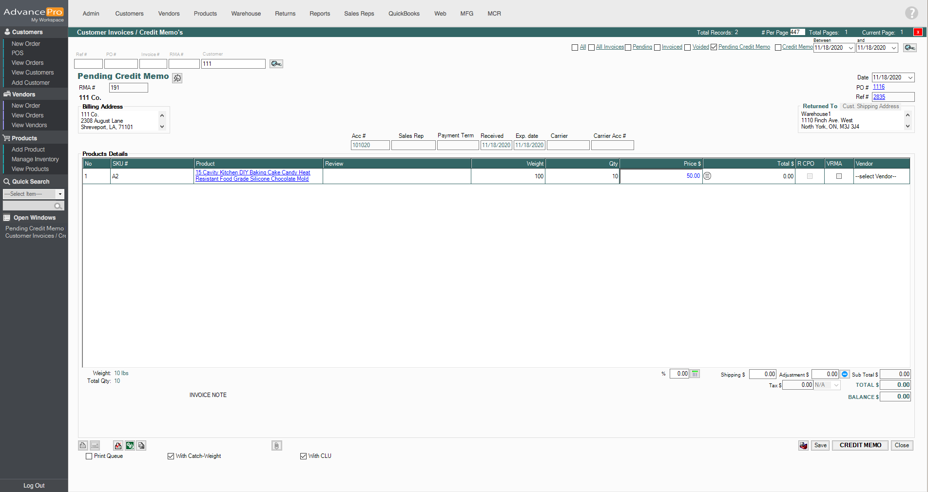 - Then click on Pending Credit Memo to filter all of the credit memos available and click on the RMA #